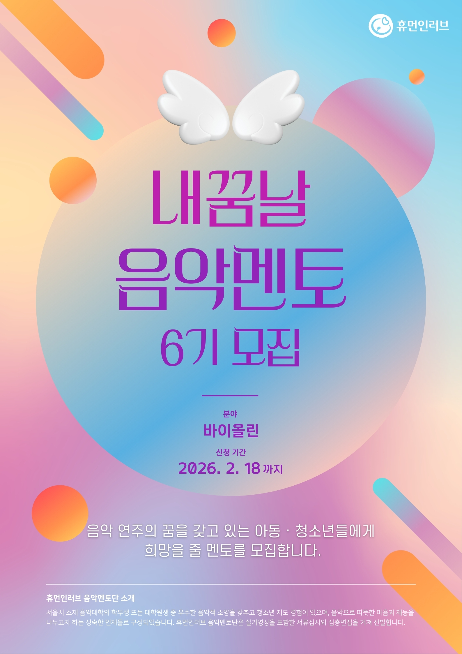 – 휴먼인러브 홈페이지(www.hil.or.kr) > 공지/모집 > ‘내꿈날’ 음악 멘토 6기 모집